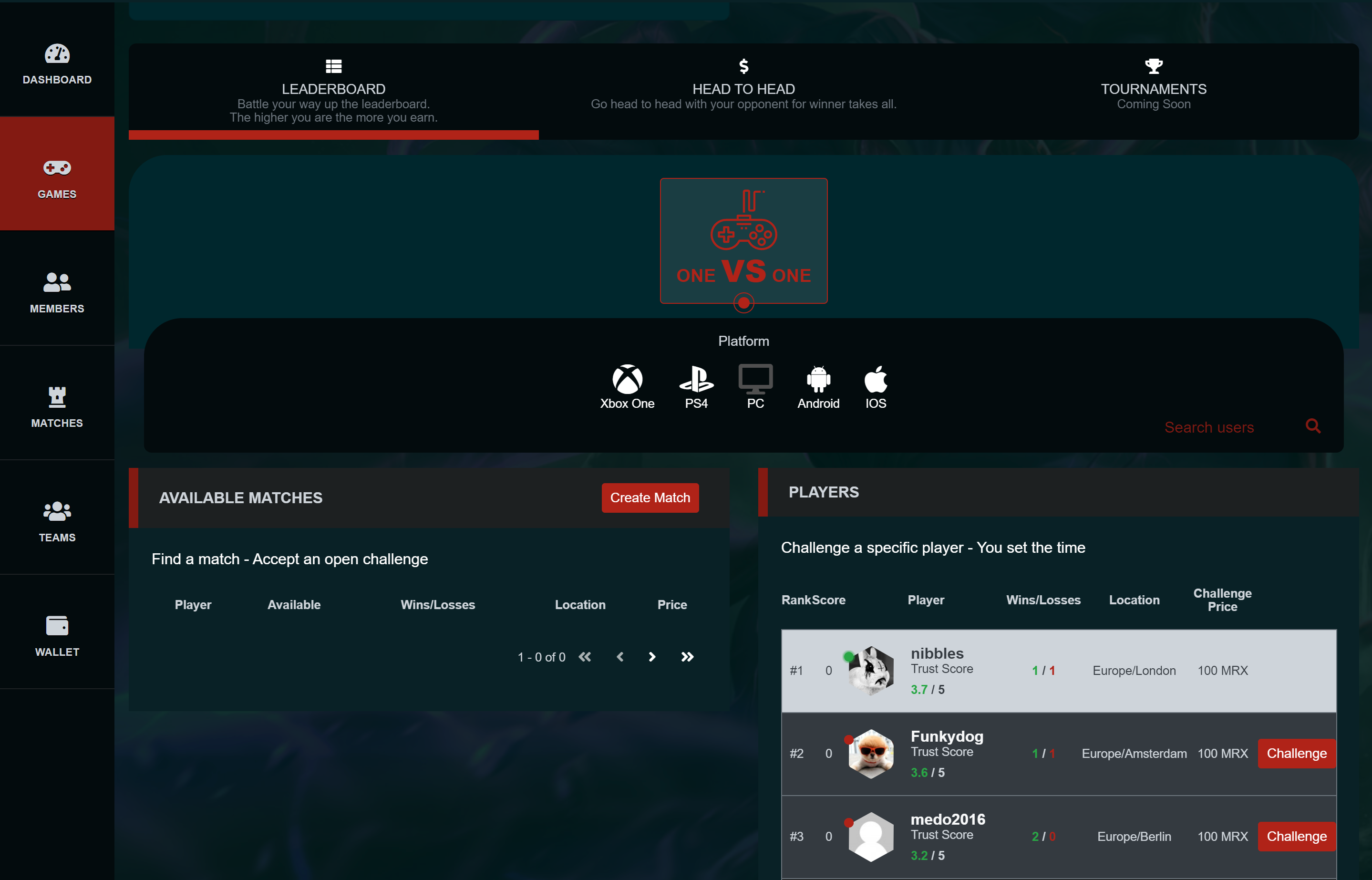 A style of play that allows users to rank up against opponents above them. The lower ranked player will pay a game fee to the higher ranked player in order to win points for ranking, and to move up. The higher ranked players will have to battle to win and keep their spots on the leaderboard. If they fail to do so, they’ll be overtaken by those ranked below them. There are separate leaderboards for every game. Eligible leaderboard matches last 90 days, after which time they become stale and no longer count towards your leaderbord score. This is to allow new users to participate against seasoned pro's, whilst also requiring high ranked users to continue to accept matches to keep their ranking status.